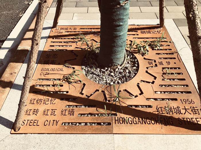 經(jīng)過整治提升后的,紅鋼城大街全線拓寬為雙向六車道。人行道上采用磚紅色的耐候鋼包邊站石,行道樹的樹穴采用刻有“紅坊記憶”“紅磚、紅瓦、紅墻”等字樣的耐候鋼板篦子,就連垃圾桶、車擋等都是采用“工業(yè)風(fēng)”軸承外形,從制作、材質(zhì)上都彰顯出“鋼城文化特色”。人行道上的坐凳采用芝麻黑花崗巖雕刻,石材表面刻有齒輪、軸承、扳手、錘子等工業(yè)圖案,坐凳面層采用芬蘭防腐木。人行道上鋪設(shè)了透水磚,能“吃”進(jìn)雨水。道路兩側(cè)綠化帶和人行道行道樹選用了無患子、巨紫荊、烏桕等樹種。秋天來臨時,這些樹木的葉子將變成紅色,烘托紅鋼城獨(dú)特的文化氣息,成為名副其實(shí)的一條生態(tài)景觀廊道。