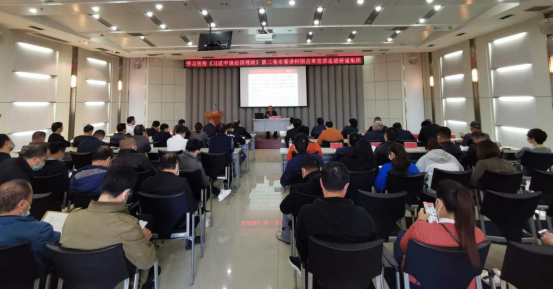 10月23日,集團(tuán)公司黨委理論學(xué)習(xí)中心組(擴(kuò)大)舉辦《習(xí)近平談治國(guó)理政》第三卷專題宣講報(bào)告會(huì),邀請(qǐng)市委講師團(tuán)成員、江漢大學(xué)馬克思主義學(xué)院院長(zhǎng)趙興教授到場(chǎng)宣講。集團(tuán)公司領(lǐng)導(dǎo)班子成員、本部中層干部、全體黨員及所屬單位領(lǐng)導(dǎo)班子成員共70余人參加活動(dòng)。這次活動(dòng)也是集團(tuán)公司與武昌區(qū)白沙洲街八鋪街社區(qū)黨建共建活動(dòng)的一項(xiàng)重要內(nèi)容,八鋪街社區(qū)黨委副書記沈嬌也來到現(xiàn)場(chǎng),參加宣講活動(dòng)。