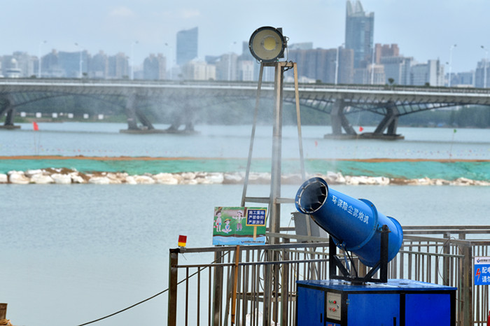 為了防塵工地?fù)P塵影響周邊環(huán)境,在現(xiàn)場(chǎng)設(shè)置了防塵棚,配備了專(zhuān)門(mén)檢測(cè)PM2.5的揚(yáng)塵在線監(jiān)測(cè)設(shè)備,以及霧炮機(jī)等。同時(shí),對(duì)東湖圍堰上的裸土全部采用綠色紗網(wǎng)進(jìn)行了覆蓋,讓整個(gè)圍堰看上去像一條綠色的長(zhǎng)龍橫臥在東湖內(nèi)。