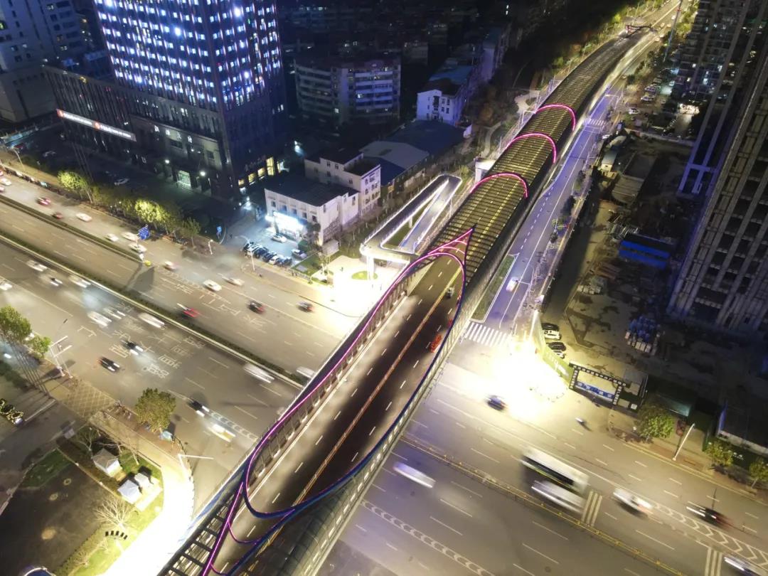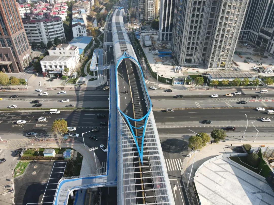 沙湖大道跨徐東大街立交工程是改善民生的重點(diǎn)工程,西起秦風(fēng)路,東至楊園南路,全長(zhǎng)1.13公里,其中橋梁長(zhǎng)475米,采用“主線橋+地面輔道”方式上跨徐東大街。沙湖大道跨徐東大街立交工程高架橋是人行過街天橋和跨線高架橋結(jié)合的功能橋,主線橋梁優(yōu)美的藍(lán)色曲線與聲屏障韻律感構(gòu)架融為一體,猶如鯤鵬展翅一般。