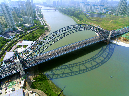 漢江灣橋(原名江漢七橋)位于武漢知音橋和古田橋之間,是漢江上第七座公路橋梁。項(xiàng)目于2017年12月開(kāi)工建設(shè),2021年5月1日建成通車(chē)。工程全長(zhǎng)2754米,其中跨江主橋長(zhǎng)672米。主橋標(biāo)準(zhǔn)橋面總寬47米,采用主跨408米中承式鋼桁系桿拱橋,主跨位居國(guó)內(nèi)同類型橋梁第二。橋面總寬47米,雙向六車(chē)道布置,同時(shí)預(yù)留遠(yuǎn)期拓寬至八車(chē)道條件。主橋上部結(jié)構(gòu)采用三跨連續(xù)中承式鋼桁拱橋,拱肋間設(shè)置菱形平聯(lián)和橫撐,空間結(jié)構(gòu)優(yōu)美,主墩支點(diǎn)處設(shè)置橋頭堡結(jié)構(gòu),與漢江灣人文環(huán)境結(jié)合度高。是國(guó)內(nèi)首次在建設(shè)過(guò)程中應(yīng)用國(guó)家“十三五”重點(diǎn)科研項(xiàng)目Q690qE橋梁鋼、新研制重載大角度爬坡100噸架梁吊機(jī)和正交異性鋼橋面板U肋全熔透焊接技術(shù)的橋梁。
